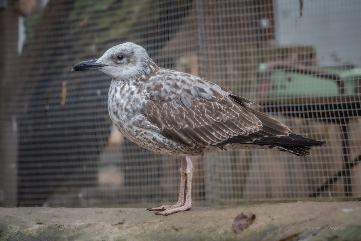 Patřím mezi tzv. „velké mořské“ racky a bydlím tu od léta 2025, kdy mi byl necelý rok. Bohužel už si nezalétám – potkala mne lapálie, na jejíž průběh si přesně nepamatuji. Možná šlo o srážku s autem? Poranění mého křídla bylo již staršího data a tak rozsáhlé, že mi jej veterináři museli amputovat. Vzrůstem jsem podstatně větší než náš „původní“ racek chechtavý a také toho mnohem více spořádám. V průběhu prvních let života, než pohlavně dospějeme, my rackové několikrát změníme zbarvení. Tak se při návštěvě expozice nedivte, že možná ve skutečnosti už vypadám trochu jinak než tady na fotce.